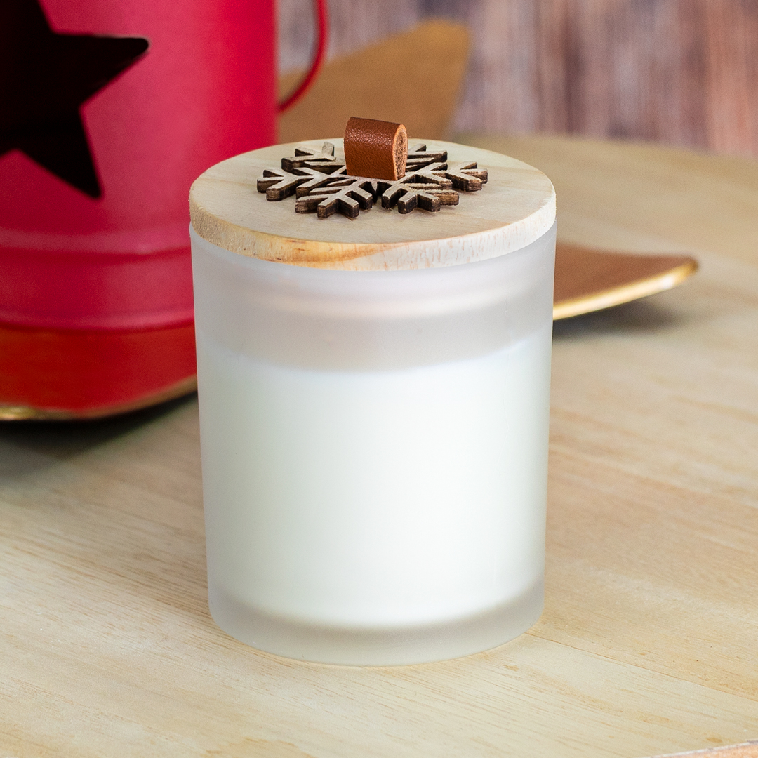 Bougie design de Noël au parfum de vanille. Fabriqué en verre, avec un plateau en bois poli et un relief en forme de flocon de neige. Présenté dans une jolie boîte kraft individuelle.