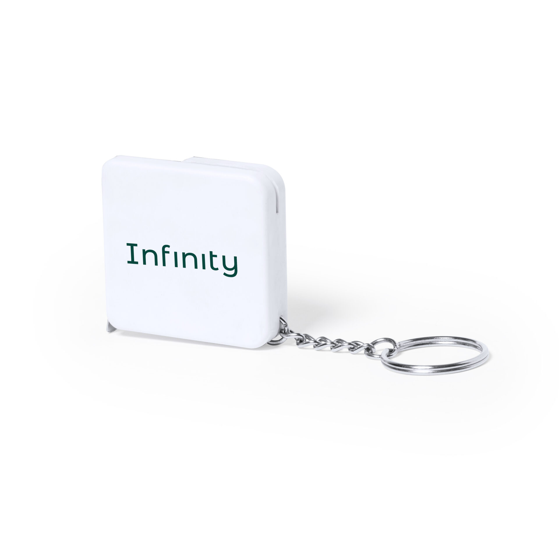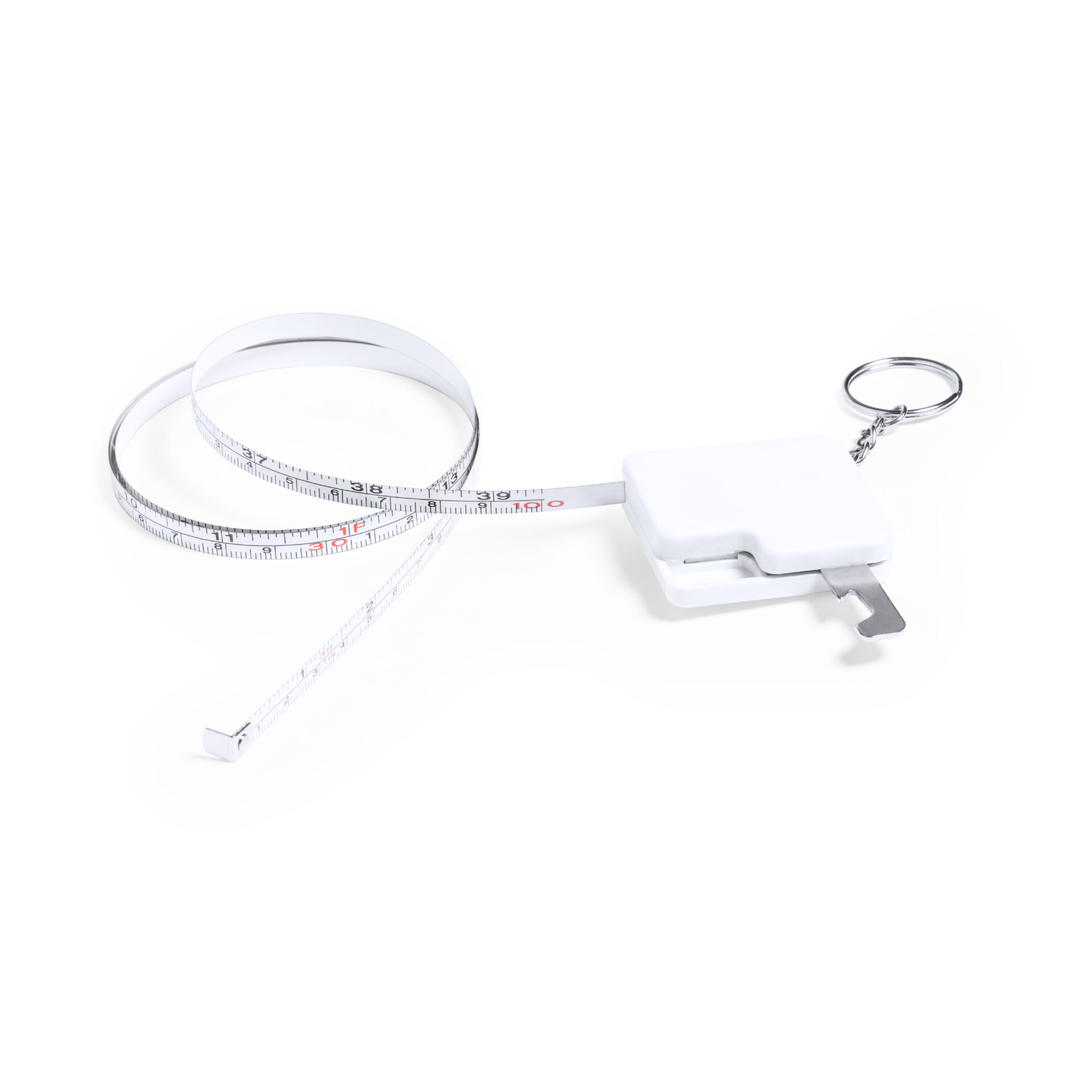 Mètre ruban de 1 m en ABS blanc résistant, avec ouvre-porte métallique intégré au corps. avec grande surface de marquage et anneau en métal chromé. feuille avec mesures en centimètres et pouces.